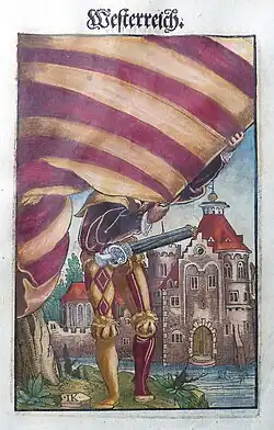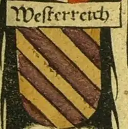 The Westrich not being a well-defined fief but a mosaic of fiefs which became a stake in rivalries between regional and local princes and lords, the images vary. An imaginary coat of arms was attributed to it by a kind of genealogical claim, namely coticé of gold and azure of eight pieces[14] This coat of arms, claimed by René II of Lorraine as prior to that of the House of Lorraine,[15] reflects an imaginary[16] linking Lotharingia to Austrasia[17] coat of arms, equally imaginary but taken up with a border of gules broken by a Burgundy[18] claiming to reconstitute the ancient Lotharingia, were banded with six pieces of gold and azure.[18] Similarly, we find in a later armorial[19] the arms of Westrich almost identical to those of Austrasia, banded with six pieces of silver and azure.[20]