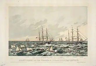 The total loss was valued at over $1,600,000 ($51.7 million in 2025 dollars).[12] Twenty-two of the wrecked vessels were from the Port of New Bedford in Massachusetts.[13] Except for the two that were salvaged in 1872, the rest were crushed in the ice, sank, or were stripped of wood by the local Inupiat.[9][14] It is reported that the Concordia, George Howland, and the Thomas Dickason, owned by George (Jr.) and Matthew Howland brothers, were not insured and represented 1/3 of their fleet.[10] There were about 200 American whaling ships and 20 British whaling ships in the Pacific and Arctic Oceans prior to this disaster.[15]
