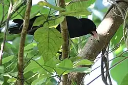 It is a short and stocky forest bird (40–41 cm in length) with a short, squared-off tail and a relatively large head with a very distinctive deep and curved pale ivory-coloured bill with a darker tip. The dark nasal bristles, though not thick, are quite apparent against the pale coloured bill. The bird overall is very glossy black with a greenish-purple gloss to the head and purple gloss to the rest of the body. The iris is pale grey or white in the adult bird and the legs and feet are black.