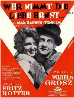 Who Takes Love Seriously? (German: Wer nimmt die Liebe ernst...) is a 1931 German romantic comedy film directed by Erich Engel and starring Max Hansen, Jenny Jugo, and Otto Wallburg.[1] It was shot at the Marienfelde Studios of Terra Film in Berlin and on location in the city. The film's sets were designed by the art director Heinrich Richter.