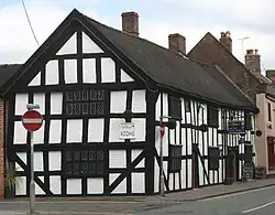 The former Widows' Almshouses are an L-shaped building on the corner of Welsh Row and Second Wood Street. The 17th-century part of the building faces Welsh Row and comprises a terrace of three black-and-white cottages with a timber frame infilled with bricks under a tiled roof.[1] It has six bays and two storeys, with a gabled end to Second Wood Street.[1][20] A two-storey 19th-century extension in brick faces Second Wood Street.[1]