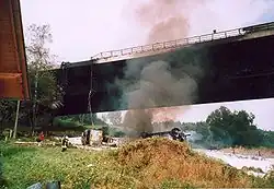 At 10:40 on 26 August 2004 a car, whose driver was not holding a license,[1] collided with a tanker truck containing 32,000 liters of fuel on the Wiehltal Bridge. The guard rails were designed only to stop vehicles up to 13 tons and were unable to hold the truck, which fell 30 meters off the A 4 Autobahn and exploded. The truck driver was killed; the heat damage destroyed the load-bearing ability of the bridge and it had to be closed to traffic.