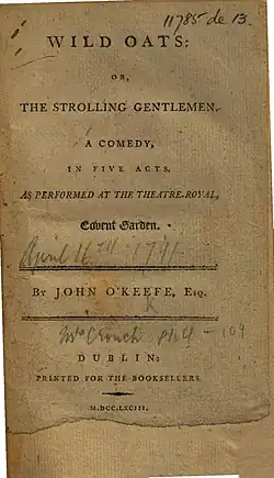 Wild Oats is a comedy play by the Irish writer John O'Keeffe which premiered at the Theatre Royal, Covent Garden in 1791. O'Keefe's eyesight deteriorated so the play would have been dictated to his daughter Adelaide O'Keeffe.[2] The original Covent Garden cast included John Quick as Sir George Thunder, William Thomas Lewis as Rover, Joseph George Holman as Harry, Richard Wilson as John Dory, Thomas Hull as Banks, William Cubitt as Gammon, Joseph Shepherd Munden as Ephraim Smooth, William Blanchard as Sim, James Thompson as Sailor, Charles Farley as Sailor, William Macready as Midg, Jane Pope as Lady Amaranth and Mary Wells as Jane. The Irish premiere took place at the Crow Street Theatre in Dublin on 5 December 1791.[3]