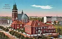 - Former presbytery at 7 Wileńska Street – built between 1909 and 1911, designed by Jürgen Kröger in a semi-modernist style.[8] It is a freestanding,[17] two-story building on a rectangular plan,[8][17] made of red brick with plastered decorative elements.[8] The front façade features a decorative portal, semicircularly closed, flanked by Ionic columns with capitals. Above the portal is an oculus. In front of the building stands Racibórz's only remaining old gas lantern (now converted to electric).[8][17] The side façade features an avant-corps,[8] and the building is topped with a mansard roof.[8][17]