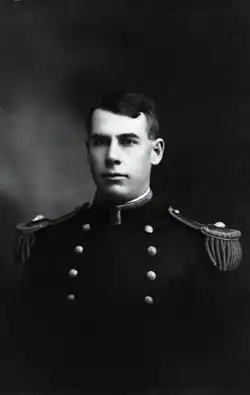 Wilhelm Lee Friedell graduated from the United States Naval Academy with the class of 1905. He then served aboard the USS Kentucky for his mandatory two years of service at sea, and was commissioned as an Ensign in the U.S. Navy in 1907.[6] Still aboard the Kentucky, Friedell took part in the Second Occupation of Cuba and in 1908 he took part in the voyage of the Great White Fleet. He was transferred to the USS Helena where he served in the South China Sea as part of the Yangtze Patrol. Friedell took command of the USS Villalobos January 1910 and continued the Yangtze Patrol until October 1911. He then became a Navigator aboard the USS New Orleans.[6] While serving aboard the New Orleans he led a landing party at Nanking during the 1911 Revolution to protect the American Consulate. He was then assigned to the Naval Academy as an instructor from March 1912 until April 1914. He then assumed command of the First Division, Submarine Flotilla, Atlantic Fleet aboard the USS C-3. He held this command from June 1914 until September 1916. He then took command of the USS Bushnell; his command continued throughout World War I in European waters.[6] Following the war, Friedell led the Submarine Repair Division at the Philadelphia Navy Yard before returning to Annapolis as an instructor. He was then assigned to the USS Connecticut as her executive officer, a position he held from June 1921 until the following spring. He then assumed command of the submarine tender USS Rainbow and the Submarine Division 12. From 1923 until 1926, he again returned to Annapolis as an instructor. From 1926 until 1928 he commanded Submarine Division 11. In 1929 Friedell completed a senior course and the Naval War College and became head of the Department of Electric Engineering at Annapolis until the summer of 1931. In February 1936 he took command of the USS Colorado. While in command in 1937, he aided in the search for Amelia Earhart after her plane went missing.[6] In November 1940 he took command of the Submarine Force, U.S. Fleet until January 1941. He served as the Commandant of Mare Island Naval Shipyard from early 1941 until 1944 when he took command of the Eleventh Naval District and Naval Base San Diego. He retired in 1946 as a Rear Admiral. Admiral Friedell died January 27, 1958, at Naval Medical Center San Diego and was Buried at Rosecrans National Cemetery, San Diego, California.[6]