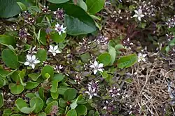 Wilhelmsia physodes is distinctive in the family because of its large, inflated ovary that develops into a round, purple capsule up to 10 mm in diameter, partially septate (divided inside) into 3 compartments, each with 2 teeth on the outside. The plant is a perennial herb spreading by means of underground rhizomes. Stems are generally prostrated except for the upright flowering stalk. Leaves are up to 15 mm. Sepals are green, tinged with purple. Petals are white. [6][8][9][10]