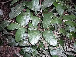 Wilkiea hugeliana is a tall shrub or small tree, typically 1–8 m (3 ft 3 in – 26 ft 3 in) high with a dbh of up to 10 cm (3.9 in).[3][4] Its leaves are arranged in opposite pairs, egg-shaped, oblong to narrowly elliptic, 60–150 mm (2.4–5.9 in) long and 10–80 mm (0.39–3.15 in) wide on a petiole 5–12 mm (0.20–0.47 in) long. The leaves are leathery, have a prominent midvein and toothed edges.[4][3]