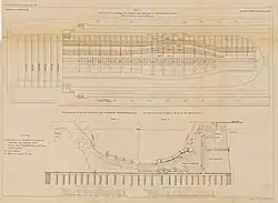 The steam frigate HNLMS Wassenaar was the first ship to use the rebuilt drydock on 26 October 1861. For the docking it had been totally emptied. Its rigging had been removed, but the masts remained in place. Boilers and machinery remained on board, which was very important. 28 tons of ballast had been put near the bow to get the keel level. Draft was then 4.44 m fore and 4.57 m aft.[30] The blocks were high 0.77 m to 1.05 m, so there was from 4.515 m to 4.935 m of water above them. There was 7.25 m of space left between the rudder axis and the inside of the lock door.[31] The maximum length of a docking ship was then estimated to be 16.45 m more, and a draft of 5.5 m would be possible at high tide.