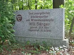 Willi Sänger resistance to National Socialism is memorialized in the Socialist Central Cemetery Friedrichsfelde in Berlin's Lichtenberg district.