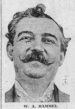 After a career as a grocery man, W. A. Hammel was first elected sheriff in 1898, serving a four-year term that ended with his defeat by William White.[4] He was elected sheriff again in 1906.[4] He was reportedly given "considerable credit" for arresting the brothers behind the 1910 Los Angeles Times bombing.[4][7] He retired from law enforcement for good in 1913.[8] At the time of his death one newspaper reported, "His most renowned exploit was when, singlehanded, he outrode a Mexican in a horse race to the border, shot it out with him and brought him, wounded, back to Los Angeles to face a trial for murder."[1]