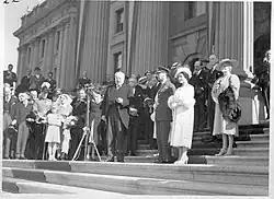Aberhart (speaking) welcoming King George VI and Queen Elizabeth to Alberta in May 1939