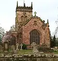 - St Mary's Church, Acton, near Nantwich, Cheshire. Upper part of the tower was blown into Nave, March 1757. Sandstone. The church must have been extensively re-built and the Medieval entrance has been altered and embellished. Remarkable ornamented west gable to Chancel. Ornamentation to tower below parapet, which has ‘gun slits’ in the crenulations (cf Seigford). Four crocketed corner pinnacles with lower mid-ball pinnacles on tower. Sundial surmounted with Baker's typical ball pinnacle.[21]