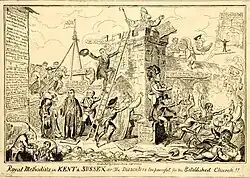 From 1820 to 1824 Collyer edited, with James Baldwin Brown the elder and Thomas Raffles, The Investigator, a quarterly. It attacked Lord Byron and Percy Bysshe Shelley as immoral.[6] The article "Licentious Publications in High Life" of 1822, after Shelley's death, received a reply "Canting Slander: To the Reverend William Bengo Collyer" over a number of issues of The Examiner, attributed to William Hazlitt.[7] In 1823 Collyer rode out a scandal around his examination of young men, in the Addington Square baths, that was brought up in The Lancet.[8][9] That same year, he was elected to the American Philosophical Society.[10]
