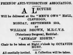 12. ^ "Anti-vivisection Meeting in Clevedon". Mercury: Clevedon, Nailsea, Portishead, Yatton. 30 September 1905. p. 6. Retrieved 13 January 2025 – via Newspapers.com.