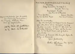 An account of this highly unusual event was written at the time by Sir Henry McMahon.[13][14][15][16][17] It was performed in an unusual style, the Emir taking all three ordinary degrees of masonry at once - a rare event rumoured to signify membership of the Roshaniya.[18]