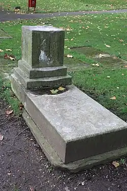 Collins died of heart disease, "terminating in dropsy", in Devonport Street on 17 February 1847. He was buried in the cemetery of the church of St. Mary, Paddington, where a monument in the form of a cross was erected by his widow.[1] The grave now stands isolated, on the north side of St Marys Gardens, after the churchyard's conversion into a public park in 1881. It has been vandalised, and the marble cross is missing; the inscription is also eroding.