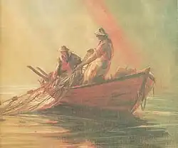 During his career deGarthe created a number of important works in oils, notable among them Looking for the Mothership, an evocative 1955 painting depicting a dory carrying a lone fisherman, searching for his lost home schooner. The same year, the Nova Scotia Museum of Fine Arts, now the Art Gallery of Nova Scotia, acquired its first deGarthe painting, Out of the Hurricane. In 1963, deGarthe created two large murals for St. John's Anglican Church in Peggy's Cove. The canvasses, 136 x 210 cm, depict a fishing boat on stormy seas with four fishers appearing to reach out to a figure of Christ on the water, surrounded by 12 gulls.