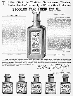 Nye's oil business, originally run out of small rented premises in Fairhaven, focused primarily on highly refined lubricant oils for watches, clocks, typewriters, sewing machines, and bicycles. In the late 1860s he acquired an entire catch of 2,200 pilot whales which would supply the raw material for his lubricating oils for several years. He expanded the business in 1877 with the purchase of a large brick building on Fish Island which became its principal refinery. By 1888, his company had become one of the world's largest suppliers of refined lubricant oils. In 1896 Nye absorbed Ezra Kelley's oil company, his main rival. He remained actively involved in the business until shortly before his death in 1910 at the age of 86.[3][4][5]