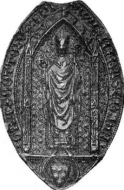 ![]() The seal of Bishop William Fraser. The other side contains his arms, making this the earliest episcopal seal from the British Isles on which the arms are represented. | |