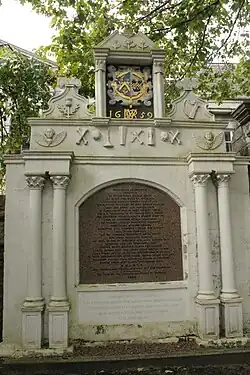 He is buried against the west boundary wall of the Kirk of St Nicholas in Aberdeen. The huge monument bears the date 1659: the year of the death of his wife, Katharine Rolland.[6] It was restored in the late 19th century when the original central marble inscription tablet was replaced with red granite.[7]