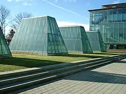 The building, which has 196,000 square feet (18,200 m2) of space,[1] is made of brick and glass.[10] The building has around 135,000 bricks and 47,000 square feet (4,400 m2) of glass. The building has four elevator shafts.[12] The main portion of the building is L-shaped, and it borders the library on its north and west sides.[4]