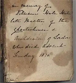 "In memory of William Hale Hale, late Master of the Charterhouse & Archdeacon of London, who died Advent Sunday, 1870." -Fly-leaf of a Prayer book of a pupil at Charterhouse School.