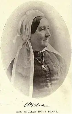 William Hume Blake, Esquire, married Catherine Honoria Hume (born in 1804), daughter of Joseph Samuel Hume, and Eliza, in 1832. The couple emigrated to Canada in 1832. Her death on 3 February 1886, resulted from an accident. She served on the Committee of Management of the Toronto General Hospital and of the Female Emigrant Society and other similar bodies.