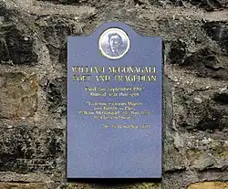 A plaque above McGonagall's last residence records his death in 1902