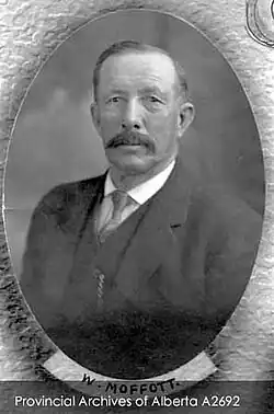 Moffat was the Town of Claresholm's first resident and Mayor.[2] He was first elected to the Alberta Legislature in the 1913 general election to the Claresholm under the banner of the Alberta Liberal Party. He defeated Conservative candidate D.S. McMillan and Independent candidate G. Malshow.[3] In the 1917 general election he was defeated by Louise McKinney,[4] who thus became the first woman elected to a Legislature in the British Empire.