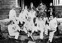 An eleven member cricket team made up entirely of Newhall family members. William Newhall is in the front row holding the bat.