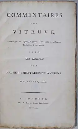 In 1771 Newton published the earliest English translation of the first five books of Vitruvius, as De Architectura libri decem, written by Marcus Vitruvius Pollio. In 1780 he issued, in French, Commentaires sur Vitruve, with many plates. The complete work of Vitruvius (including a translation of the remaining five books) was published after Newton's death in two volumes, 1791, by his brother and executor, James Newton. Of the plates, a few only were by William, the majority being by James.[1]