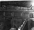 The W. T. Wyllie memorial in Portsmouth Cathedral is positioned on the East wall of the Quire and east of the Corporation Pew and remembers the second son of William Lionel and Marion Amy Wyllie. William Thomas Wyllie served with the 2nd Durham Light Infantry and was killed in action at Montauban on the Somme on 19 July 1916. He was acting as a Brigade Major at the time and is buried in Mametz Cemetery. He left a widow and three children. The memorial features a sculptured figure in silhouette/high relief which lies along the bottom half. This figure is the dead body of an officer lying on his back, arms by his side. His shirt sleeves are rolled up and he wears braces, trousers and boots. His head rests on a cushion surrounded by a laurel wreath. The inscription is incised in white lettering along the top half of the memorial. The bronze founders were Messrs A. B. Burton.[26][27]