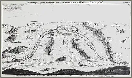 Stukeley developed a friendship with two brothers who shared many of his antiquarian interests, Roger and Samuel Gale.[50] From his father, the former Dean of York Thomas Gale, Roger had inherited a copy of the Monumenta Britannica, a work produced by seventeenth-century antiquarian John Aubrey. He showed it to Stukeley, who produced a transcription of Aubrey's document in either 1717 or 1718.[51] Piggott suggested that it was Aubrey's manuscript that first brought Avebury to Stukeley's attention. Circa 1718, Stukeley first visited the site, accompanied by the Gale brothers.[52] In 1719, he visited again, also taking in Stonehenge before traveling to Oxford to meet Thomas Hearne, an antiquarian who was highly critical of Stukeley.[53] That summer, he spent time in Great Chesterford in Essex, where he identified a Romano-British temple from crop marks in a field.[54]