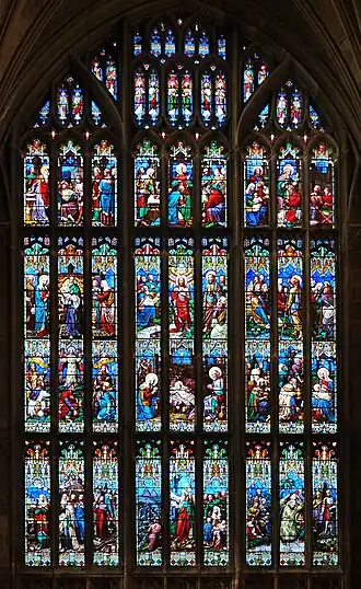 While most of the work of Wailes' workshop is to be found in the North of England, other commissions came from further afield. The most significant window glazed by the firm, and one of the prize commissions of the industry, was the glazing of the west window of Gloucester Cathedral, an enormous window of c.1430 in the Perpendicular Gothic style, of nine lights and four tiers. This window complemented, at the other end of the building, one of the largest ancient windows in the world; the east window (which is as big as a tennis court) fortunately had retained much of its 14th-century glass, comprising many tiers of figures.