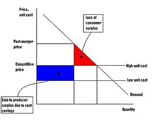 The change in overall social surplus of the market depends on whether the increase in producer surplus due to lower production costs is larger or smaller than the fall in consumer surplus due to higher prices. Note that it is theoretically possible that the fall in unit costs due to the merger could be sufficiently large that the post merger monopoly price ends up being lower than the pre merger competitive price in which case both producer and consumer surplus would increase. In that situation no tradeoff exists and the merger is unambiguously beneficial to all market participants. More generally however, a horizontal merger can involve both costs and benefits.[4]