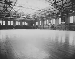 Interior view in 1930 during a physical education class. Balcony seats, windows, and lower-level bleacher seating can be seen in the background.