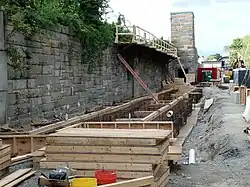 The station was closed effective January 8, 2021 due to deterioration.[27][28] On January 11, the MBTA reinstated funding for the project due to the closure.[29] The MBTA received a demolition permit on January 25.[30] Demolition of the ramps was completed in June 2021.[31][32] A $47.6 million construction contract was approved on October 27, 2021.[33] The 28-month construction phase began in December 2021.[34] Site preparation began in March 2022.[35] Demolition of the remaining platforms and ramps took place in May and June 2022. Some demolition and utility work lasted through the remainder of 2022.[36]