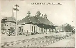 The Boston and Lowell Railroad opened between its namesake cities in 1835; local stops were added soon after.[2][3] Woburn Gates station – later Winchester – was open by 1838.[4] By the 1840s, service on the line was suitable for commuting to Boston.[2] Elimination of the grade crossing at Winchester was considered in 1903 and 1906, and again in 1915.[5][6][7] The 1915 proposal called for the tracks to be lowered by 4 feet (1.2 m) and the streets to be raised by 17 feet (5.2 m).[8] The B&M installed bike racks at the station in 1942 in an effort to reduce parking needs.[9]