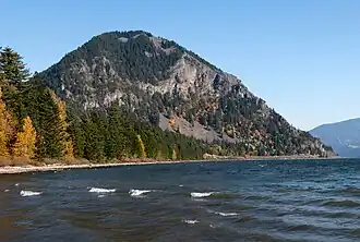 Wind Mountain is part of the Cascade Range and is set within the Columbia River Gorge, on land managed by Gifford Pinchot National Forest. The prominent landmark is situated three miles east of Carson, Washington, and two miles east of the mouth of Wind River. Precipitation runoff from Wind Mountain drains into the Columbia River. Topographic relief is significant as the south aspect rises 1,800 feet (550 meters) above the Columbia in one-half mile. Access to the mountain is via Washington State Route 14 and the 1.4-mile Wind Mountain Trail. From the summit there are views of Greenleaf Peak and Table Mountain to the west, as well as Dog Mountain to the east. The Wind Mountain Spirit Quest is a sacred archeological site near the summit created by Native American youths and dates back to 1000–200 years ago.[4] This geographical feature's name has been officially adopted by the U.S. Board on Geographic Names,[3] noting that the mountain is located in an area known for consistently high winds channeling through the Columbia River Gorge. According to Native American mythology, the Great Spirit set whirlwinds blowing in constant fury around Wind Mountain as punishment for those who had broken a taboo and taught white men how to snare salmon.[5] The Lewis and Clark Expedition visited this area on October 30, 1805, where they observed a submerged forest at the base of this mountain, a relic of the Bonneville landslide which occurred six miles downstream.[6]