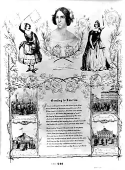 ^Poster of Jenny Lind's first engagement in New York. The theatre was named "Jenny Lind Hall", before it was finished. Because of delays, the theatre was not ready for Lind's first performance and was named "Tripler Hall" instead. The complete poster is from the Library of Congress collection, LC-USZ62-1425.