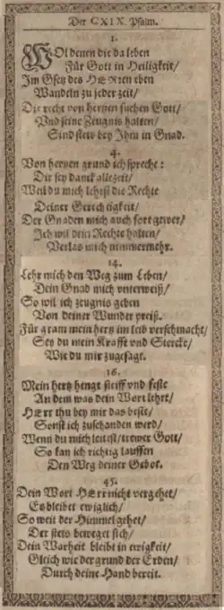 Becker was professor of theology professor at the Leipzig University and pastor at the Lutheran Nikolaikirche in Leipzig. He used a vacation time to write a psalter of metric paraphrases of all psalms, as a Lutheran pendant to the reformed Genevan Psalter.[1] Psalm 119 has 176 verses in Hebrew which he rendered in 88 stanzas of seven lines each. The first line was originally "Wol denen die da leben Für Gott in Heiligkeit".[2]