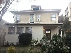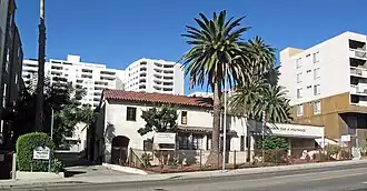 The older 1903 Hollywood School for Girls building originally belonged to Charles Hanchett whose widow sold it to the school. The two-story wooden house uses clapboard siding with a corner porch, bay windows, and a rear porch in a Prairie School design. When owned by the school, the downstairs served as a meeting space while the upstairs served as the principal's living quarters.[7] Later, the artist colony used the building as the Little Theater while the Woman's Club housed guests in what became their Hospitality House.[9][12]