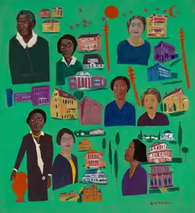 Johnson was inspired by the 1931 book Women Builders written by Sadie lola Daneil and illustrated by Hallie Q. Brown. The children's book contains biographies of Black women who Daneil considered pioneers in education, finance, and social institutions.[2][3] Included in the painting are images of the seven subjects of the book as well as a portrait of the author, Sadie lola Daneil.[4]