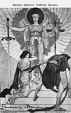 The Women Writers' Suffrage League (WWSL) was an organisation in the United Kingdom formed in 1908 by Cicely Hamilton and Bessie Hatton.[1] The organisation stated that it wanted "to obtain the Parliamentary Franchise for women on the same terms as it is, or may be, granted to men. Its methods are the methods proper to writers โ€“ the use of the pen."[2] The organisation viewed itself as a writers' group rather than a literary society.[3] Membership was not based on literary merit, but instead was granted to anyone who had published and sold a written work.[3] Members also paid an annual subscription fee of 2s. 6d.[4] The league was inclusive and welcomed writers of all genders, classes, genres, and political persuasions provided they were in favor of women's suffrage.[3] By 1911 the league was composed of conservatives, liberals and socialists, women of power and women who worked hard and members of the military.[5] The league disbanded on 24 January 1919[3] following the passing Representation of the People Act in February 1918, granting women over the age of 30 the right to vote.[6]