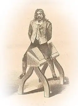 A wooden horse, Chevalet (as it was called in Spain), Spanish donkey or cavalletto squarciapalle is a torture device, of which there exist two variations; both inflict pain by using the subject's own weight by keeping the legs open, tied with ropes from above, while lowering down the subject.[1] The French called this instrument the chevalet, from the French diminutive of cheval, horse.[2]