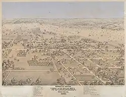 In 1851, the year after California became a state and Yolo County was formed, "Uncle Johnny" Morris settled at what is now the corner of First and Clover Streets in Woodland. Two years later Henry Wyckoff arrived and built a store he named "Yolo City".[12] The new Yolo City might have stayed a singular store if Frank S. Freeman, the man responsible for the establishment of the post office, had not bought it and acquired 160 acres (0.65 km2) of land in 1857. Freeman began to develop a town that he hoped would be a trading center for one of the richest crop-growing areas in America. He gave land to anyone who would clear it and build a home. In 1859, Freeman suggested that the town be called Woodland, which the post office accepted.[13] On July 5, 1861, the Woodland Post Office was established and Freeman became Postmaster.[14] He lost no time in developing the town by leasing or selling commercial buildings.