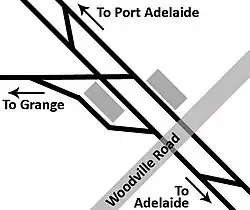 Woodville railway station, on Adelaide's Outer Harbor line, is a junction station for the Grange branch line.[1] Situated in the western Adelaide suburb of Woodville, it is 7.5 kilometres (4.7 miles) from the Adelaide railway station.