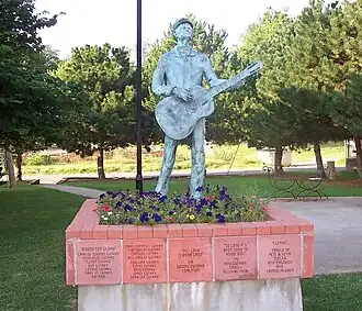 The festival, which over the years has morphed into being called "WoodyFest" by attendees,[1] was founded in 1998 and the inaugural festival included performances by Guthrie's son Arlo Guthrie, British folk-punk-rock artist Billy Bragg, Ellis Paul, Jimmy LaFave, Joel Rafael, and The Red Dirt Rangers.[3][4] For the festival's founding, the Woody Guthrie Coalition commissioned a local Creek Indian sculptor to cast a full-body bronze statue of Guthrie and his guitar, complete with the guitar's well-known inscription: "This machine kills fascists".[4] The statue, sculpted by artist Dan Brook, stands along Okemah's main street – named Broadway – in the heart of downtown Okemah.[5]