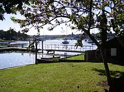 At the mouth of the estuary is the Wightlink car ferry terminal for connections to Portsmouth. On the west bank of the creek is the village of Wootton, whilst on the east bank is the village of Fishbourne. The estuary is bridged by the main Ryde to Newport road, where there once was a tide mill. The estuary is not navigable south of the bridge, and tide controls means that water is retained south of the bridge most of the time, in the old mill pond.