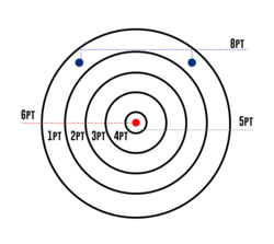 Scoring is a match system where ten knives are thrown per match. The player with the highest points of their ten thrown knives wins the match. In case of a tie, a "Sudden Death" throw is made for the highest score. Sudden death throws are done until one thrower scores higher than the other. Scoring is determined by where the knife hits the target. The WKTL targets have a red bullseye, followed by five empty rings. The scoring is 6, 5, 4, 3, 2, and 1 point respectively. Additionally, there are blue dots in the 1 point ring, known as "Kill-shot," and be hit twice per match for 8 points. Point scoring is based on the highest point value the knife touches when it lands and sticks.